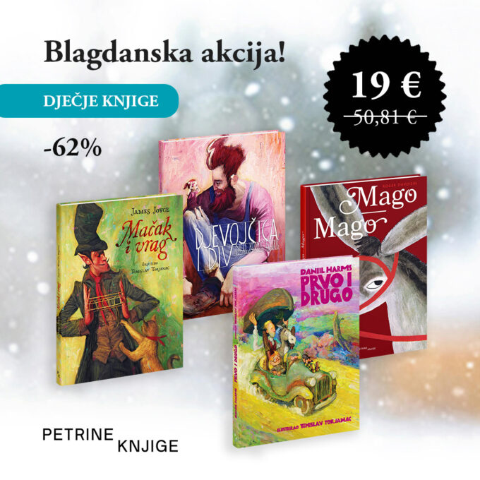 AkcijaU sklopu blagdanske akcije paket slikovnica: Mačak i vrag, Mago-Mago, Prvo i drugo i Djevojčica i div je na sniženju od 62,60% i košta samo 19,00 eura umjesto uobičajenih 50,81 eura.